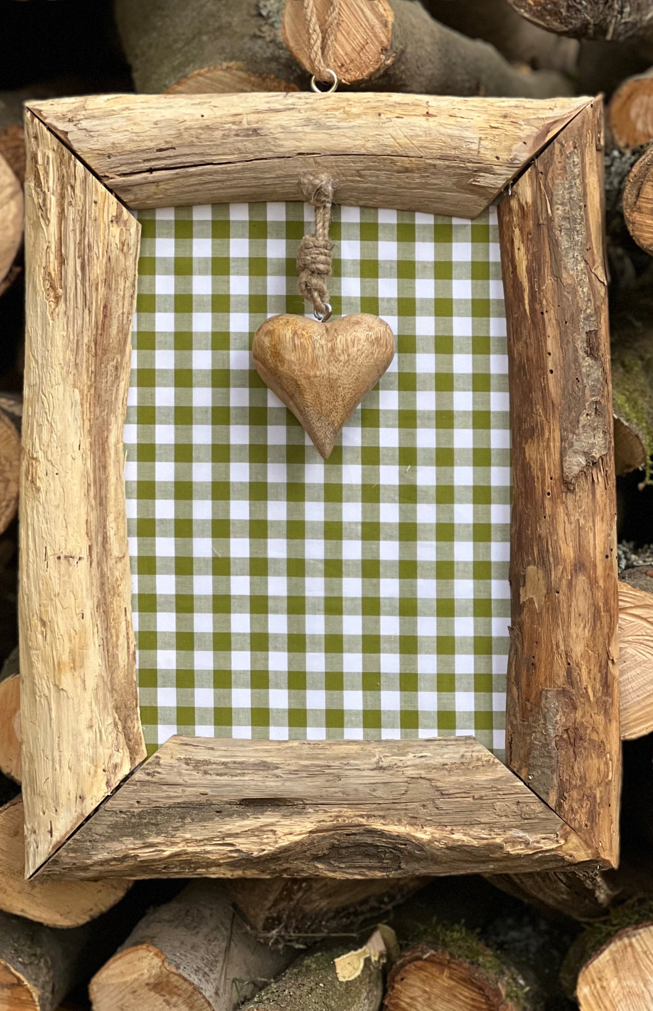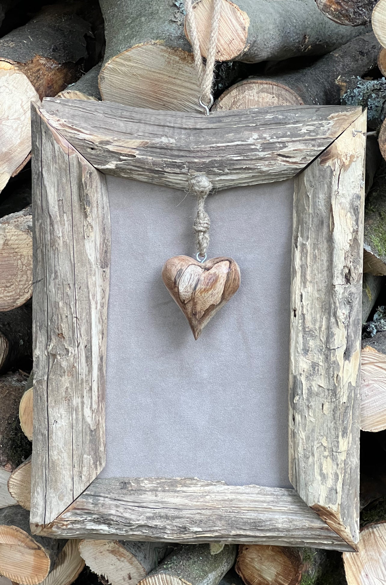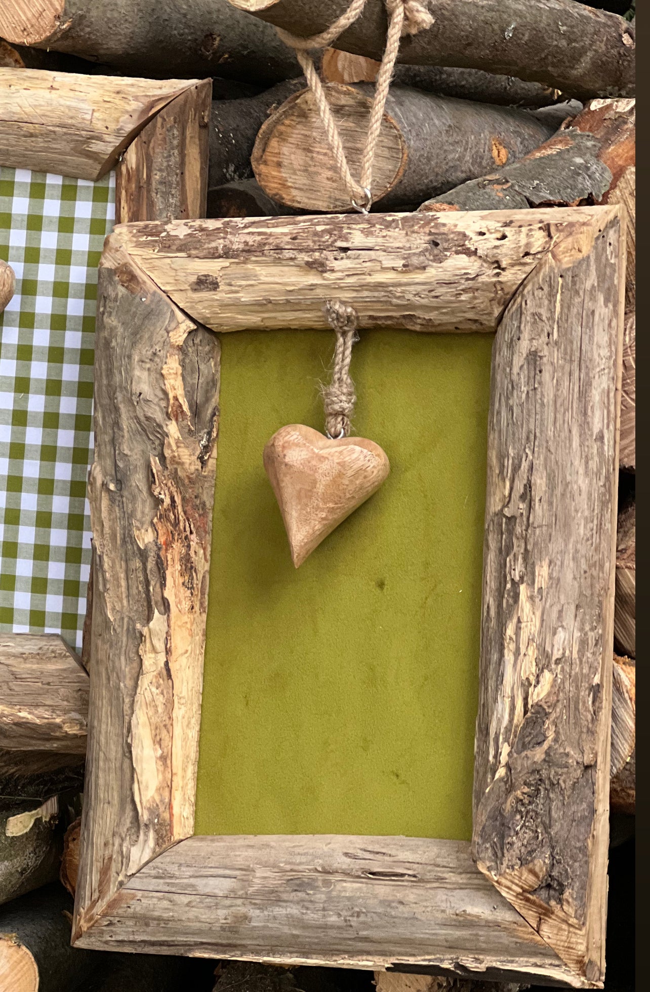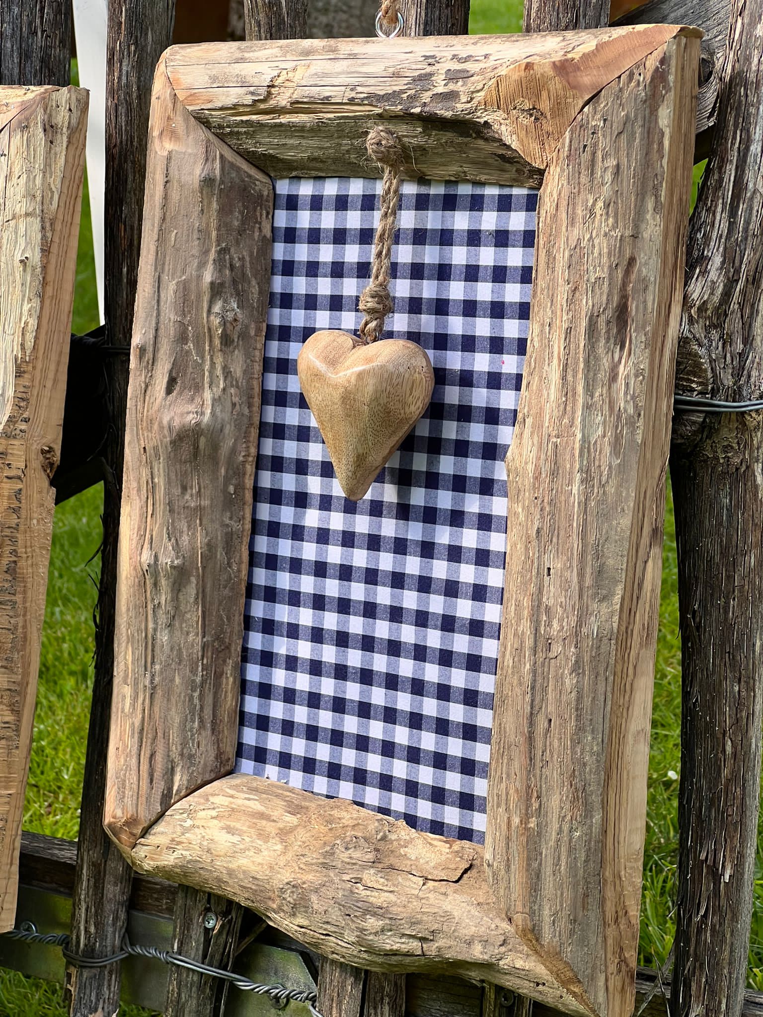 Urige Altholzbilder mit verschiedenen Stoffen bespannt und eingehängtem Holzherz.