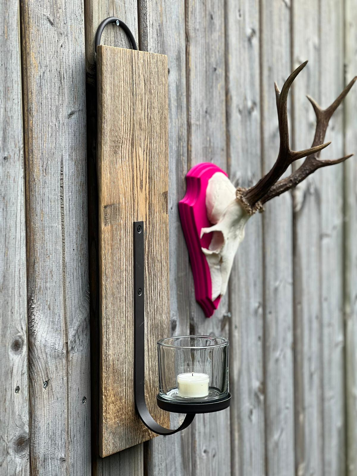 Dieser wundervolle Wandleuchter besteht aus einer Altholzplatte mit Teelichthalter in Eisen, sowie einem kleinen Teelichtglas. Abgerundet wird dieses Dekoobjekt von einem echten Geweih, wenn gewünscht. Außerdem gibt es den Wandleuchter in zwei Größen. Beide sind wahlweise mit Geweih zu bestellen. Draußen und drinnen ein Hingucker.