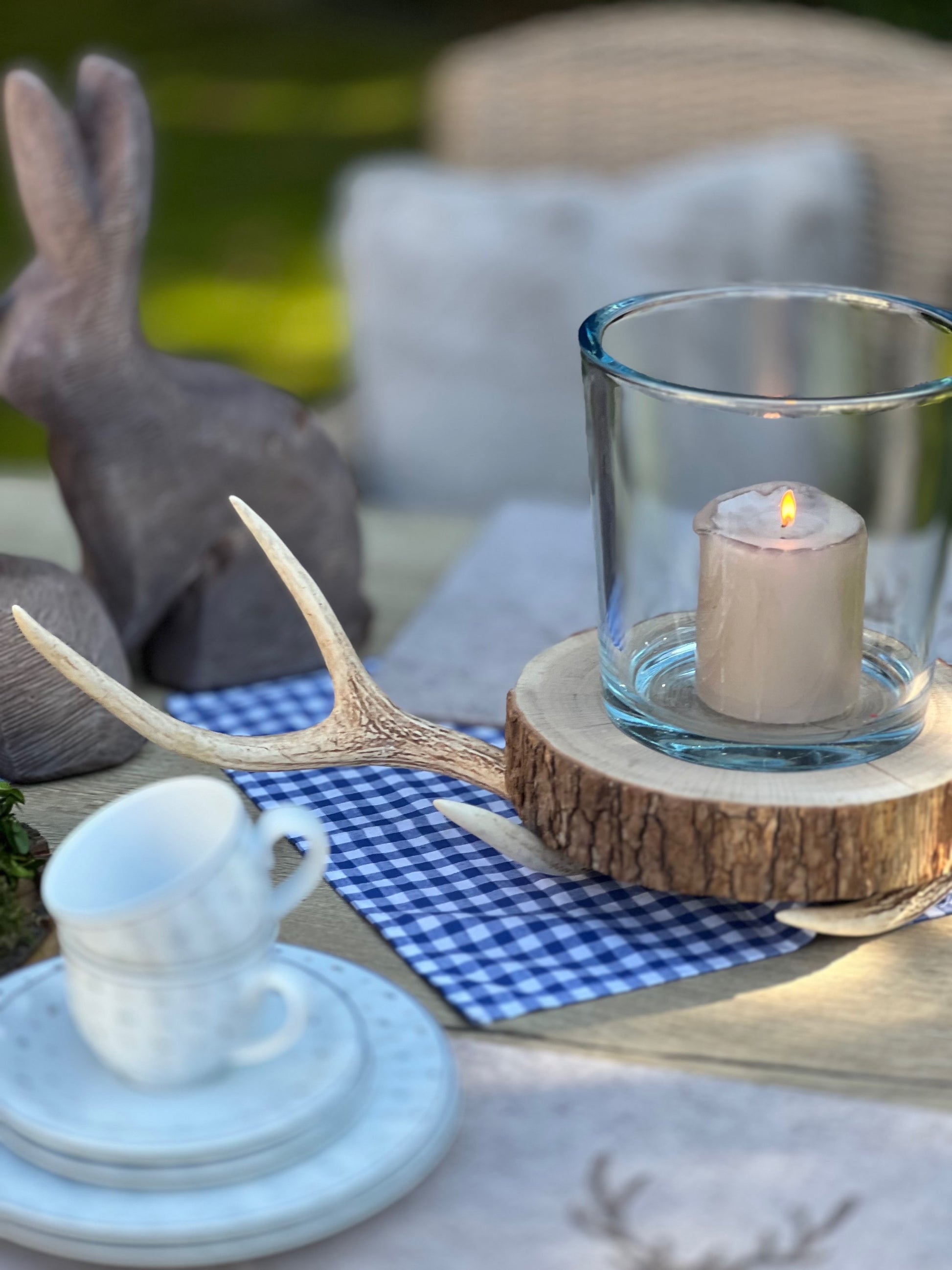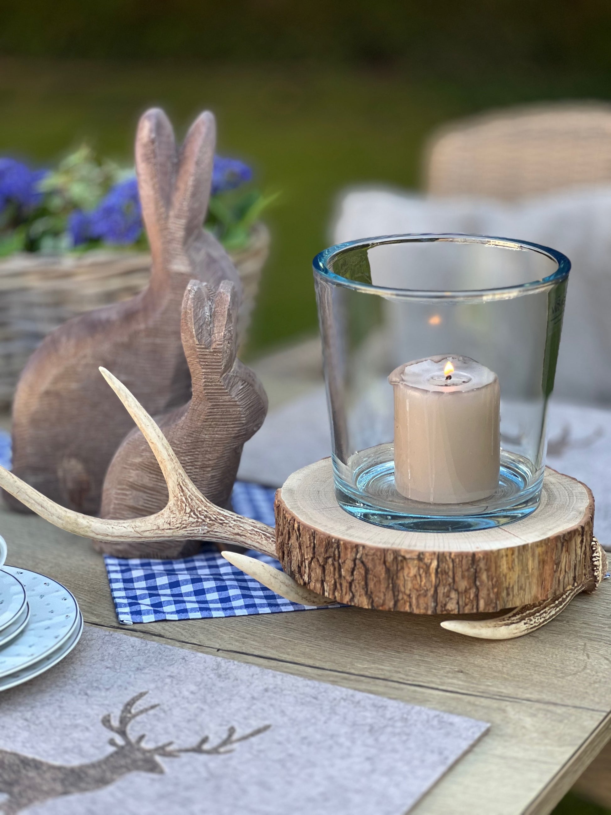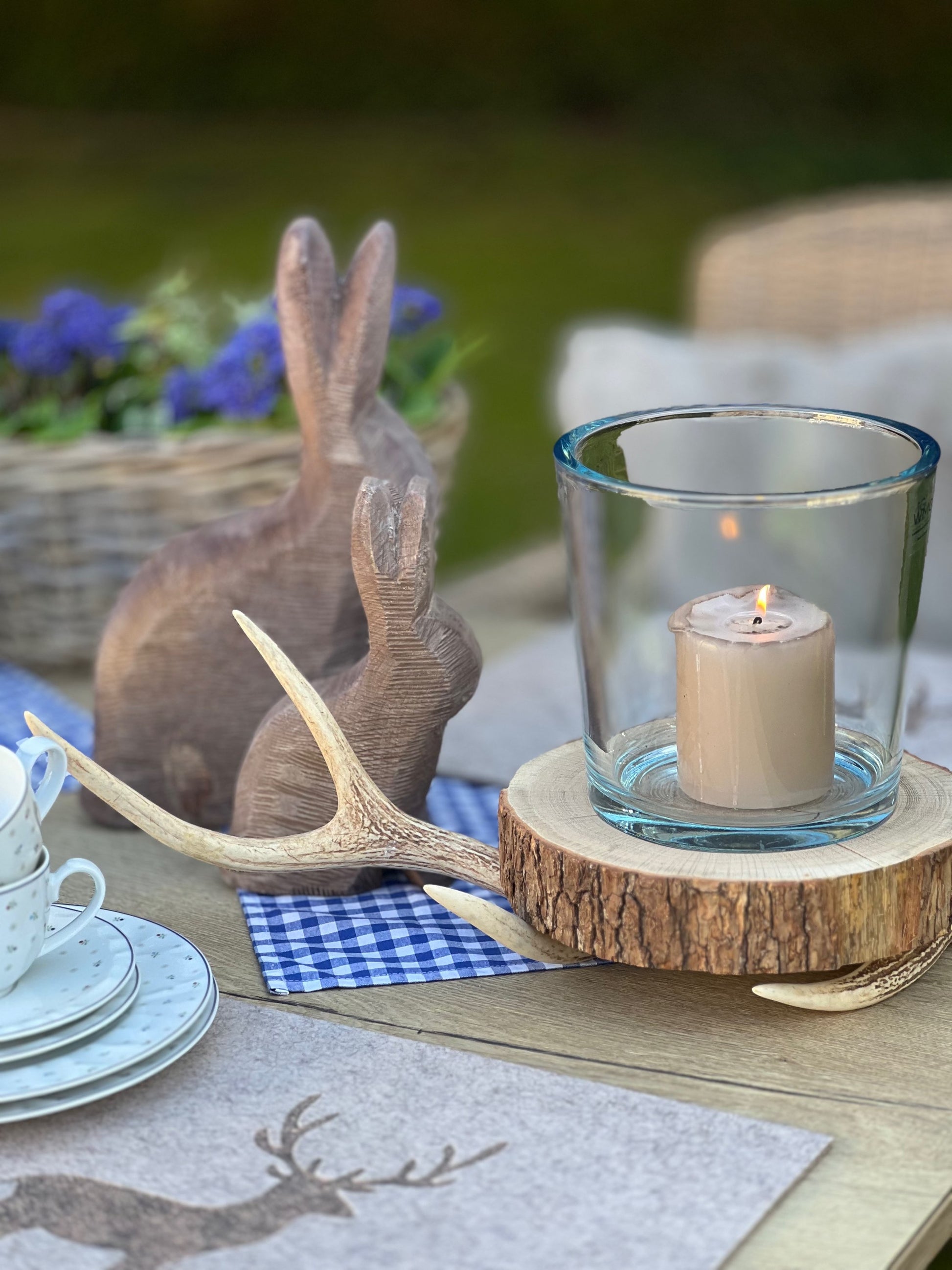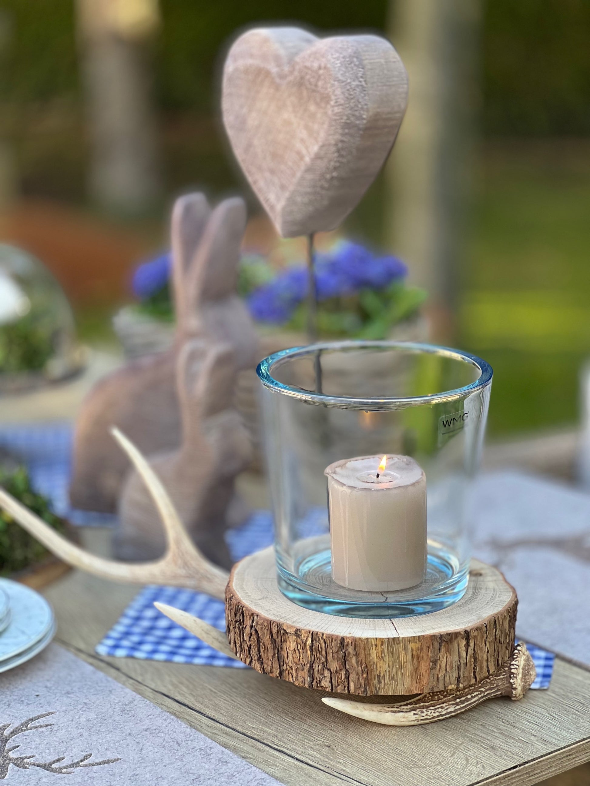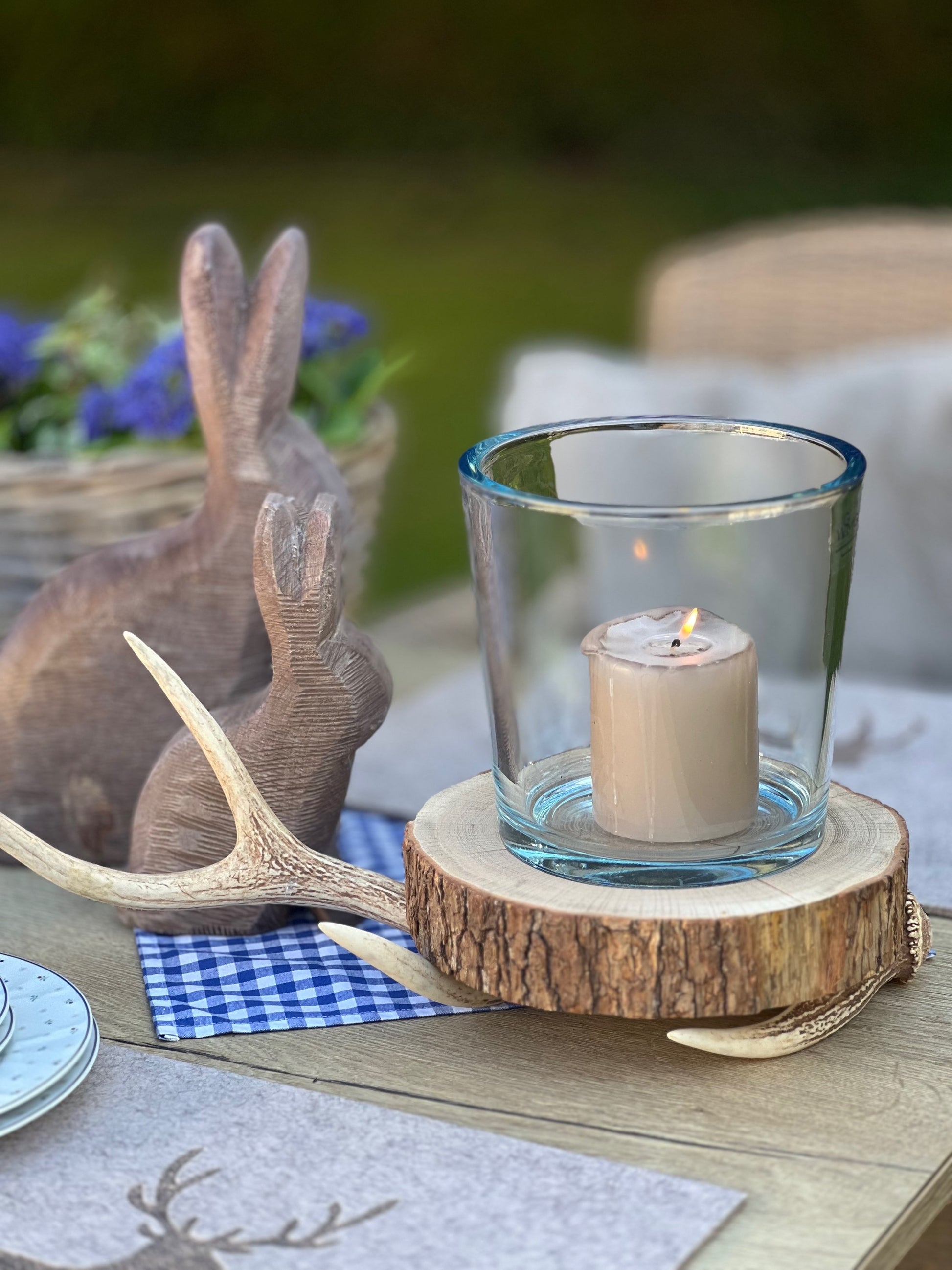 Das Windlichtglas sitzt auf einer mit einer leichten Vertiefung eingefrästen Eichen-Baumscheibe.