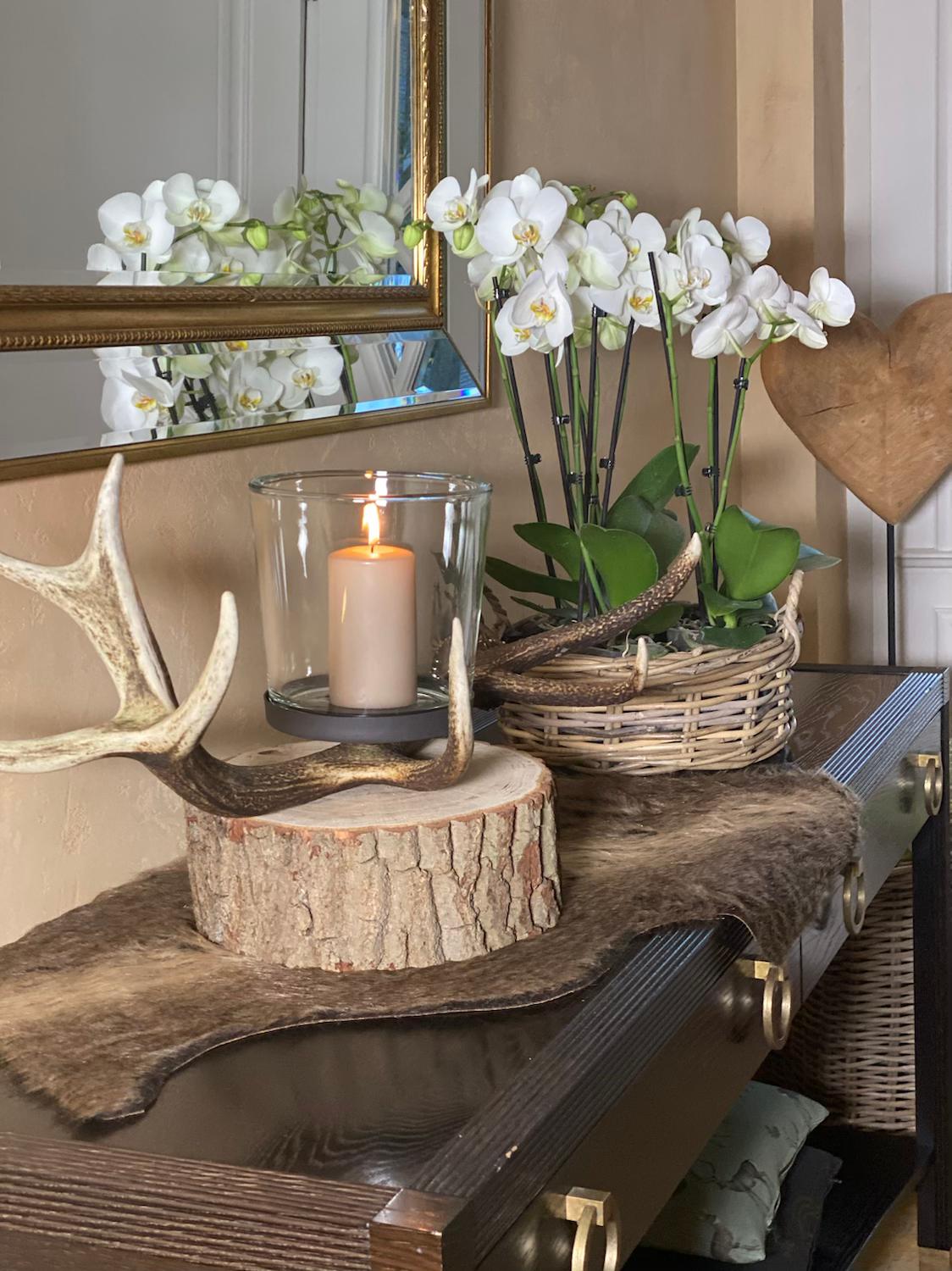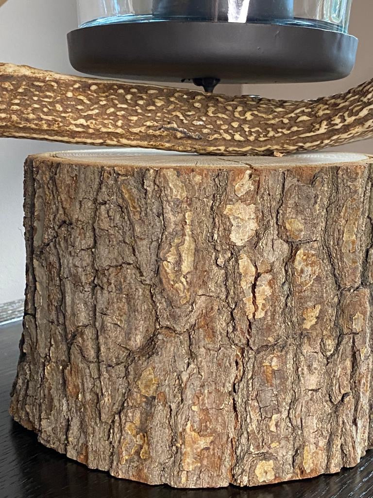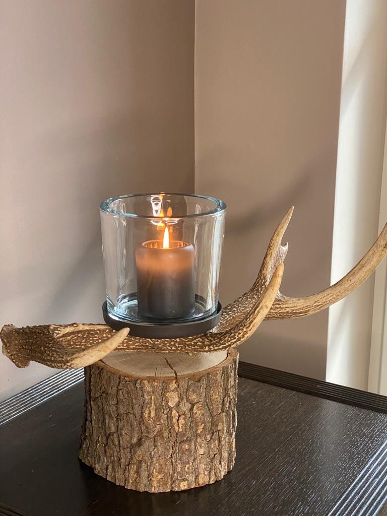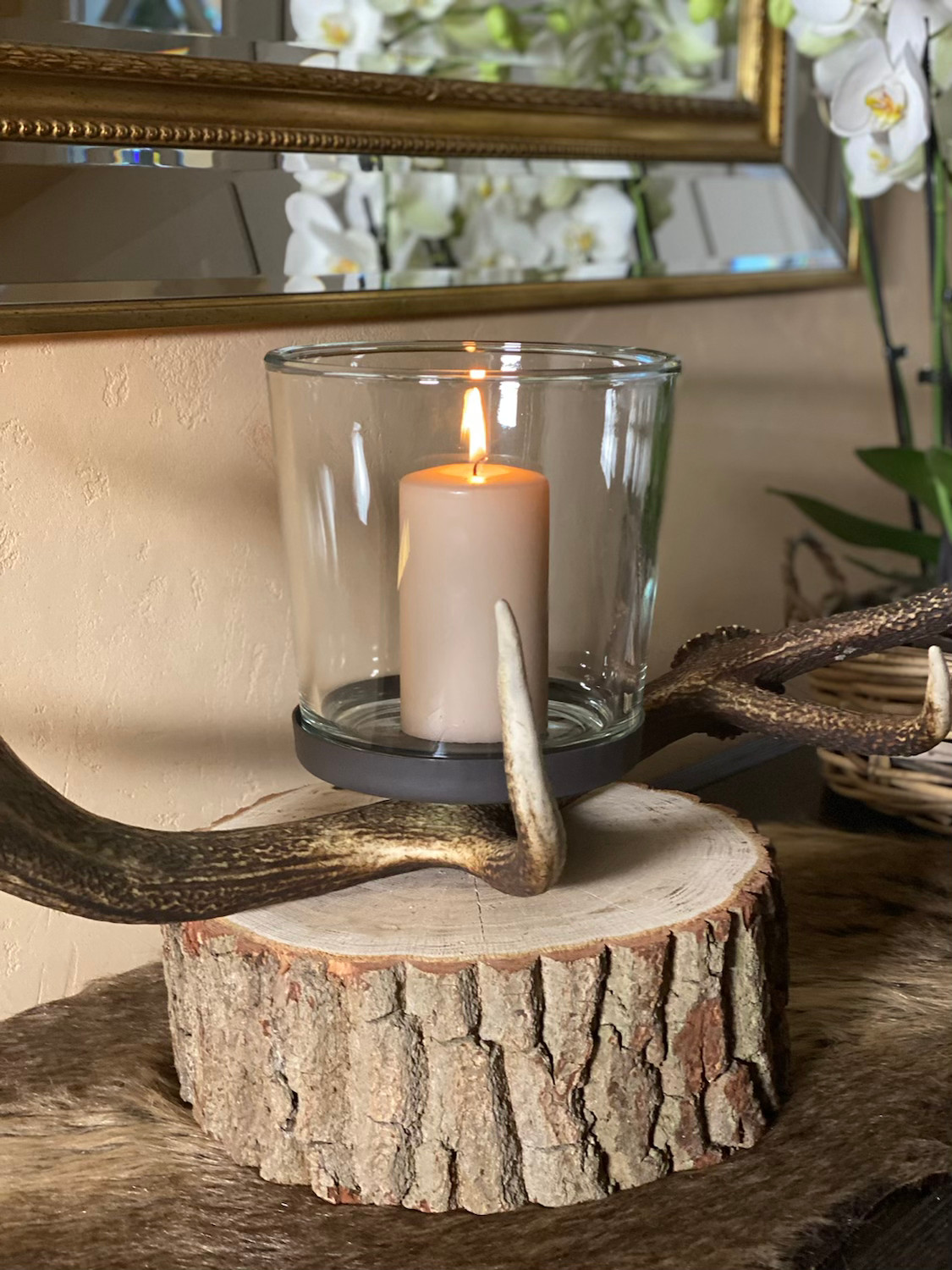 Wunderschönes Windlicht auf kleinem Baumstamm. Wahlweise mit und ohne Gehörn. In drei Größen erhältlich.