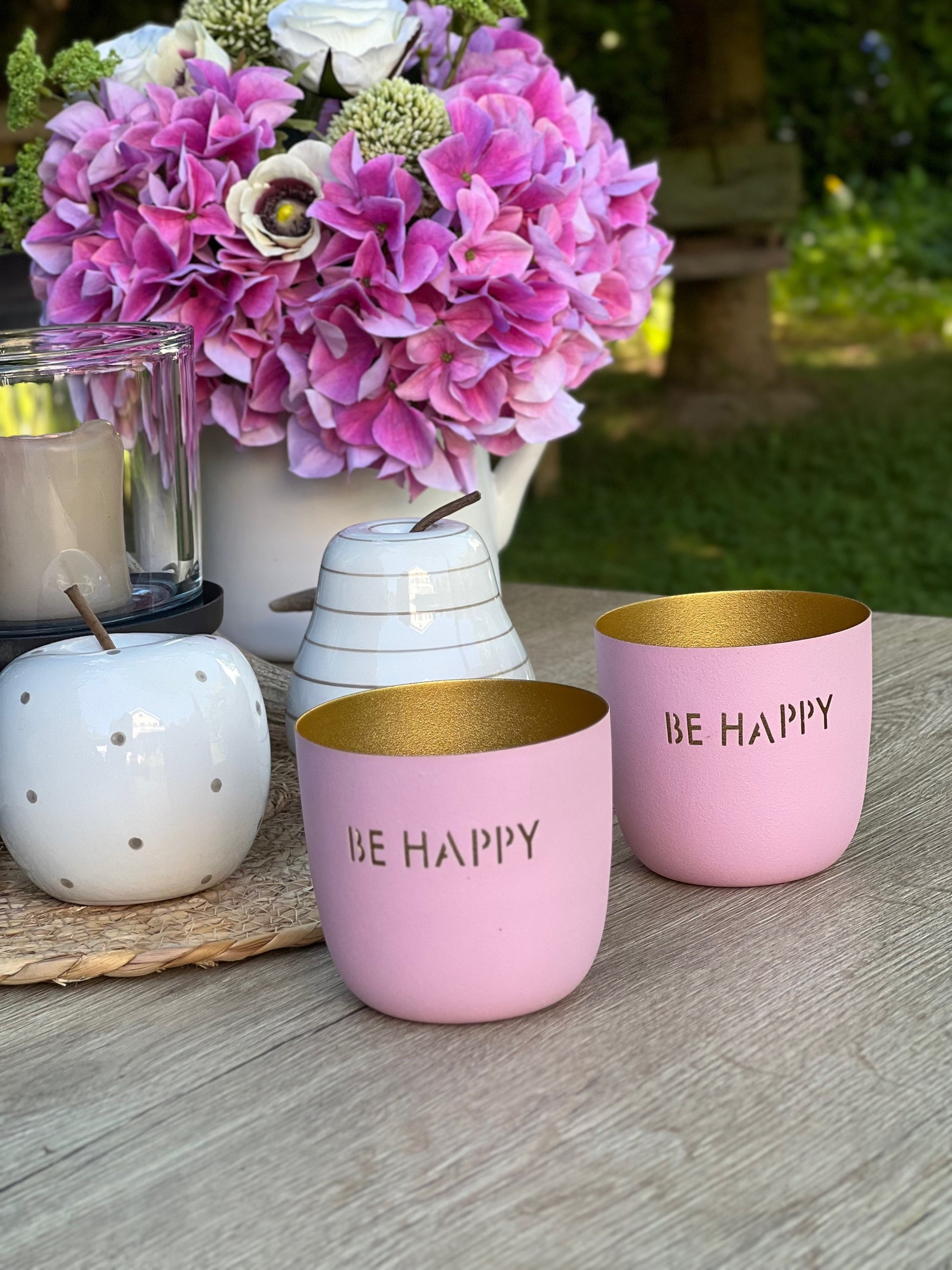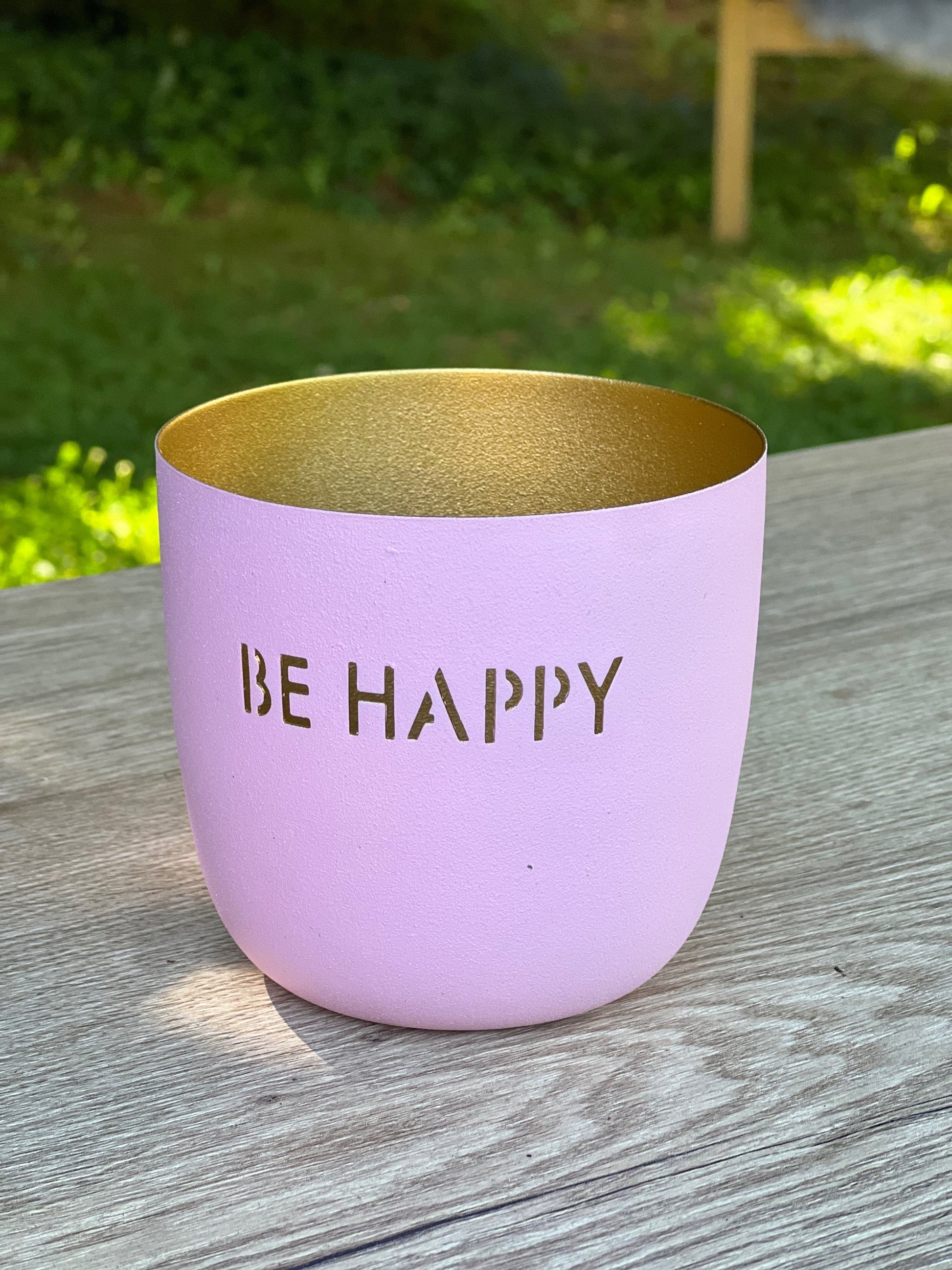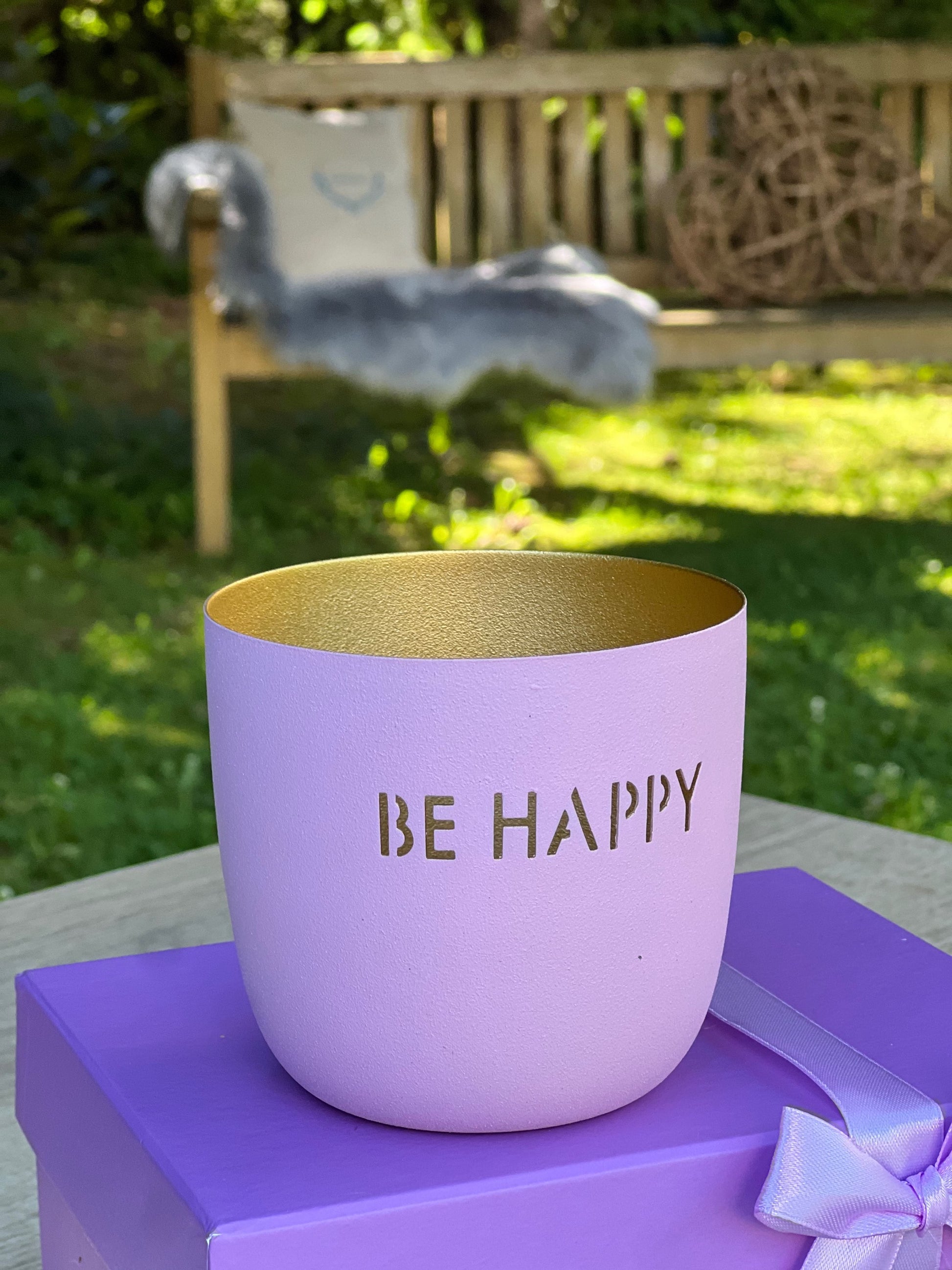 Wunderschönes Windlicht mit dem Schriftzug „Be happy“.